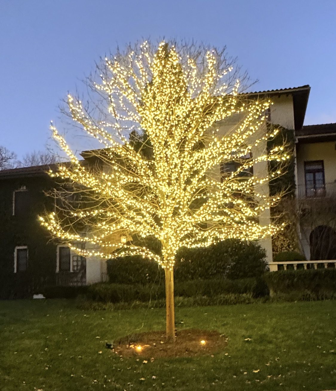 Beautiful warm white or multicolor string lights professionally installed along rooflines, trees, and landscaping features.